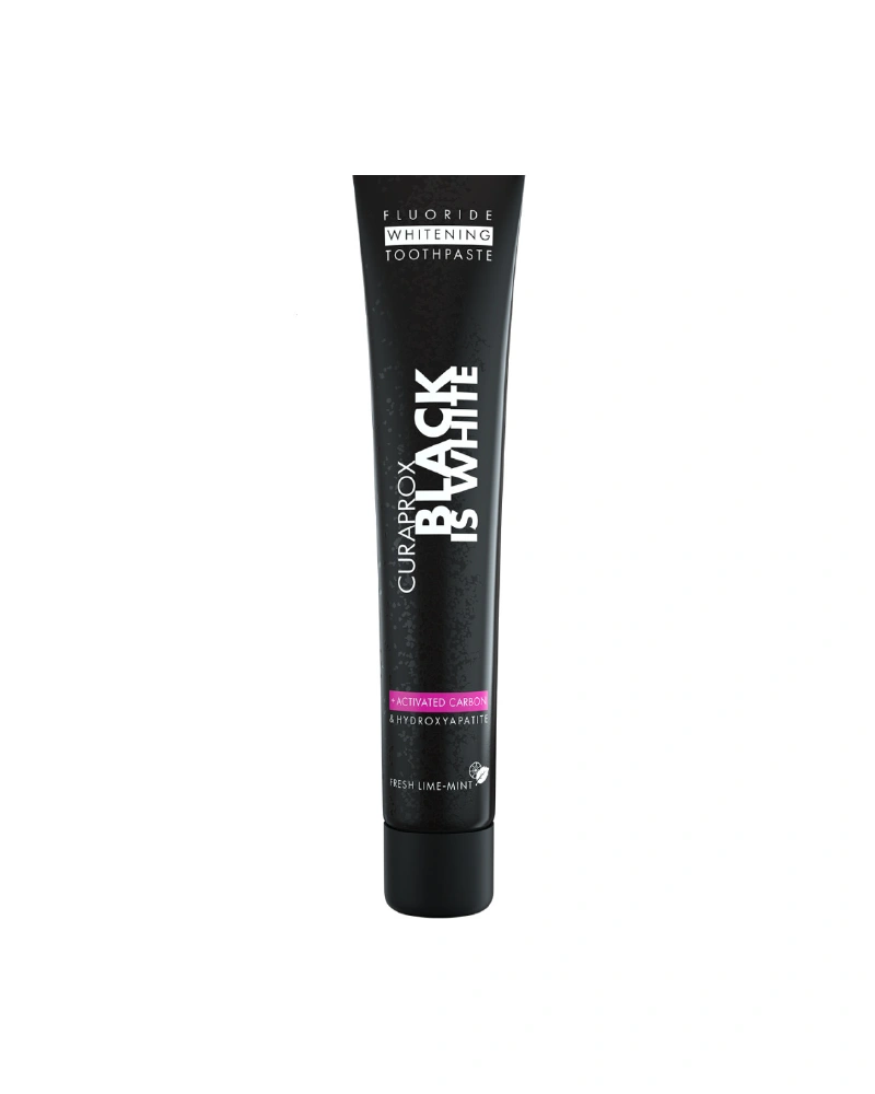 «Black is white» whitening toothpaste removes discolouration using activated carbon without abrading or bleaching. includes fluoride. Strengthens oral health: enzymes protect against tooth decay and support the salivary functions. Hydroxyapatite (nano) remineralize tooth enamel and seal exposed dentine channels.